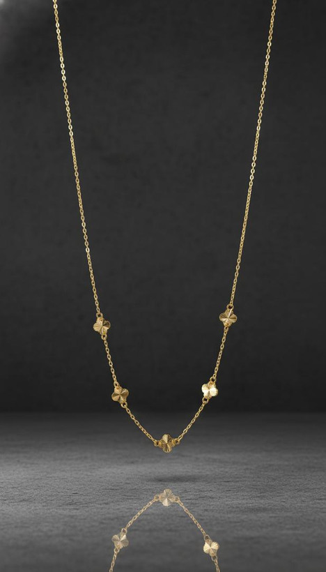 این گردنبند از طلای ۱۸ عیار ساخته شده و دارای پنج پلاک گل چهارپر تراشخورده است که به زیبایی روی زنجیر ظریف طلا قرار گرفتهاند.